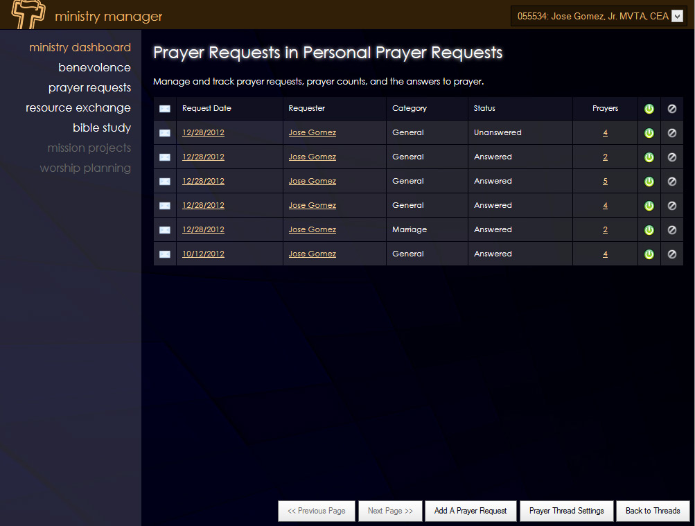 Prayer Request Threads: Create unlimited prayer request threads - independent channels of prayer that can be published to your website.